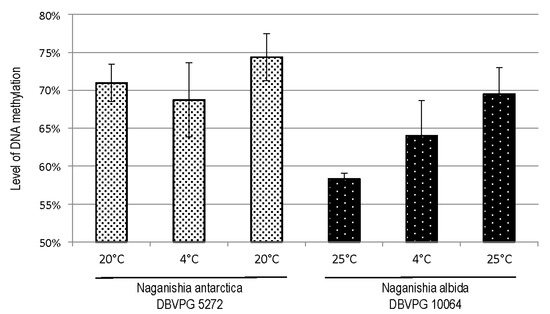 In this context, the present work was aimed at investigating the role of DNA methylation in two different yeast species belonging to the same genus, one psychrophilic (N. antarctica) and one psychrotolerant (N. albida), as a possible response to cold stress. DNA methylation has recently been studied in Candida albicans; Metschnikowia reukaufii; Cryptococcus laurentii (now Papiliotrema laurentii); and some species within the Kluyveromyces, Candida, Schizosaccharomyces, and Saccharomyces genera [39,40,42,52]. Despite the involvement of DNA methylation in the rapid response to biotic and abiotic stresses has been widely investigated in plants [46,53,54,55,56,57], none of the above-mentioned studies have taken into consideration the possible involvement of DNA methylation as a possible response induced in yeast species by cold stress.