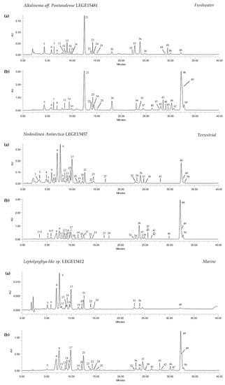 Chlorophylls were dominant over carotenoids, with chlorophyll a (36) and its derivatives (32, 33 and 38) being the most abundant and present in all strains. The predominance of these compounds in the terrestrial strain can be explained, at least in part, by the possible alteration of pigment production at the genetic level, which is caused by higher amounts of elements such as iron and phosphorous that are more abundant in these environments []. In fact, an incremental pigment production has already been reported for the diazotrophic cyanobacteria Nostochopsis lobatus upon supplementation with phosphorous and iron []. The alteration of chlorophyll production at the genetic level in terrestrial N. antarctica LEGE13457 can also be associated with rare earth oxide nanoparticles; for instance, it has been demonstrated that low cerium concentrations can act as catalysts in chlorophyll production []. Moreover, this strain originates from the Victoria Valley, Antarctica (Table 1), where the environment is harsh. This condition may regulate the metabolism of living organisms in order to increase the production of secondary metabolites with a key role in the maintenance of a balanced redox status, such as carotenoids. This deduction may also apply to C. gracile LEGE12431, the strain with second-highest pigment content, which originates from the Caburgua Lake, Chile (Table 1), an area that is also subjected to significant atmospheric fluctuations. The remaining strains, came from environments where the abiotic conditions do not fluctuate nor are they as severe as those pointed for N. antarctica LEGE13457 and C. gracile LEGE12431.