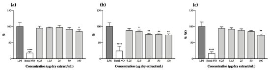 Nitric oxide (NO) production by RAW 264.7 cells in the presence of cyanobacteria acetone extracts after stimulation with lipopolysaccharide (LPS). (a) Alkalinema aff. pantanalense LEGE15481, (b) Nodosilinea (Leptolyngbya) antarctica LEGE13457 and (c) Leptolyngbya-like sp. LEGE13412. Results are expressed as % of NO relative to the control stimulated with LPS. Basal NO represents the NO produced by RAW 264.7 cells without LPS stimulation. Results are expressed as the mean ± SD of at least four independent assays, performed in duplicate. * p < 0.05, ** p < 0.01, **** p < 0.0001 (ANOVA, Tukey HSD).