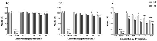 Keratinocyte (HaCaT) viability after 24 and 48 h of incubation with cyanobacteria acetone extracts. (a) Alkalinema aff. pantanalense LEGE15481, (b) Nodosilinea (Leptolyngbya) antarctica LEGE13457 and (c) Leptolyngbya-like sp. LEGE13412. Results are expressed as % of MTT reduction vs. the untreated control (CTR). DMSO (20%) represents the positive control. Results are expressed as the mean ± SD of at least four independent assays, performed in duplicate. * p < 0.05, ** p < 0.01, *** p < 0.001, **** p < 0.0001 (ANOVA, Tukey HSD).