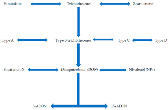 The classification of the major toxin produced by Fusarium graminearum, DON. The major toxins produced by Fusarium species are fumonisins, trichothecenes, and zearalenone. DON is a type B trichothecene which has derivatives 3-ADON and 15-ADON.