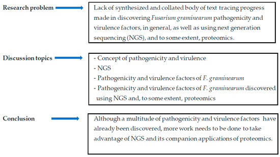 Plant pathogens have developed sophisticated penetration, infection, and colonization strategies to suppress plant defense mechanisms of susceptible hosts and cause disease. The display of minor symptoms by the plant is of least concern but excessive tissue damage and crop loss result in serious economic losses with adverse implications for society, especially in poor countries. To gain insights into how these plant pathogens develop the sophisticated strategies of attack, platforms such as next-generation sequencing (NGS), and its companion applications like proteomics, are currently being exploited. Pertinent scientific inquiry of pathogenicity and virulence processes of pathogens, comprehensive and integrated investigations remain imperative and must take advantage of such high-tech platforms as NGS to generate multitudes of useful datasets. Among microbes associated with the plant are fungi which encounter plants, penetrate and colonize plant tissue to either cause disease or live within the colonized plant in a symbiotic relationship with the host. Fungi which cause diseases are called fungal pathogens and their adverse effects can range from tiny spots on the plant surface to significant symptom expression and tissue collapse. In causing diseases, fungi employ various strategies. They can penetrate the host using penetration structures and develop a large network of hyphae within the intercellular spaces. Through the hyphae, these fungi draw nutrients from the living plant cells. This mode of attack is called biotrophy. Alternatively, fungal pathogens kill the host tissue and derive nutrients from the dead tissue. This mode of attack is called necrotrophy. In the hemi-biotrophic mode of attack, the fungus successively adopts a necrotrophic lifestyle after biotrophy. The invasion of the plant by the pathogen is usually carried out through the production of factors used for plant tissue manipulation to gain physical access into the tissues as well as draw nutrients. These factors enable the plant to cause disease as well as advance the infection within the interior of the tissue, ultimately worsening the disease condition. The ability of a fungus to cause disease is termed pathogenicity, and the ability to worsen the disease is called virulence. The terms pathogenicity factors and virulence factors are loosely used to refer to any substance a pathogen uses to parasitize the plant. We will also use these concepts jointly and will not attempt to classify the various disease-causing factors as either pathogenicity or virulence factors. As a necrotrophic fungus, the wheat pathogen Fusarium graminearum Schwabe (teleomorph Gibberellae zeae) produces, among other things, cell wall-degrading enzymes (CWDEs) and toxins. Plant tissue exposed to the CWDEs and the toxins loses firmness, macerates and cell contents leak. As the cell contents provide nourishment to the fungus, it grows and advances into the inner tissues. The disease spreads and eventually, depending on other factors, the affected part dies. With its ability to produce toxins, F. graminearum, a homothallic (self-fertile) ascomycetous fungus, of the Order: Sordariomycetes and Family: Nectriaceae causes Fusarium head blight (FHB), one of the most economically important diseases of wheat, barley, rice and other grain crops worldwide [1,2,3,4,5]. Also known as scab, this devastating disease was first described in 1884 in England and since then, its prominence has increased worldwide with outbreaks reported in temperate and semitropical areas globally [1,6,7,8,9]. Under favorable conditions, FHB can advance from initial infection to the destruction of the entire crop within a few weeks [1]. A combination of factors, global warming, increase in wheat production under irrigation and the concomitant increase in no-till practices is the likely cause of the recent resurgence of FHB. F. graminearum is favored by high temperatures and irrigation splash disseminates its propagules. Wheat spikes infected by F. graminearum have a bleached appearance and grain infected with this fungus is shriveled with pale grey color and an occasional pinkish discoloration. Over and above these undesirable qualities, ingestion of significant amounts of mycotoxin-contaminated grain may cause vomiting, headache, and dizziness in humans. Animals may lose weight and suffer anorexia. Serious effects of ingestion of large amounts of mycotoxins include leukoencephalomalacia in horses, pulmonary edema in swine, and kidney and liver cancers in mice (mentioned in Proctor et al. [10]), and a plethora of records link mycotoxin consumption to cancer in humans. However, some of these sicknesses are linked to mycotoxins produced by other Fusarium species, and not F. graminearum. The primary mycotoxin produced by F. graminearum is the trichothecene deoxynivalenol (DON) (see Figure 1 for the classification of DON) and other toxins produced include zearalenone, nivalenol (NIV), 4-acetylnivalenol (4-ANIV), and DON derivatives 3- and 15-acetyldeoxynivalenol (3-ADON and 15-ADON) [2,11,12,13,14]. The serious effects of crop infection by F. graminearum require in-depth studies on the pathogen, primarily its pathogenicity and virulence factors which can be comprehensively studied using, among other techniques, whole-genome sequencing, transcriptomics using the convenient, reliable, and large data-generating tools of NGS and proteomics. Recently, a multitude of data has been generated for F. graminearum either to understand its genome organization or its gene composition as well as genes involved in plant attack. Although more work is still required, the pace at which this information is generated is too high to allow sufficient time for synthesis, organization, and communication. Meanwhile, with the dynamics of climate change, the relations between the pathogen and the plant require active and rapid utilization of the data which is generated for use to ensure plant health and ultimate