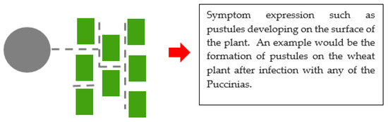 An illustration of biotrophy between a plant pathogenic fungus and a plant. The grey circle represents a fungal spore. Dotted lines represent the germ tube which has developed to form a network of hyphae, and the green rectangles represent plant cells. Finally, symptoms are expressed.