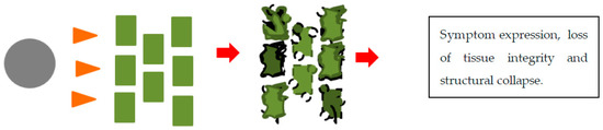 Pathogenicity is the ability of an organism to cause disease, virulence, on the other hand, refers to the magnitude of the disease caused. There are three modes of attack by fungi. One mode requires ‘cooperation’ from the plant and living plant tissues. The fungus forms structures for penetration and a network of hyphae intertwined within the colonized plant tissues. Nutrients in the plants are extracted by this mass of hyphal structures formed in the intercellular spaces of the plant. This mode is called biotrophy (Figure 3). Other fungi release a barrage of degradative enzymes and toxins to lyse plant tissues and in so doing feed on the leaking cell contents and degraded tissue. This is called necrotrophy (Figure 4). Hemi-biotrophy is a hybrid mode between biotrophy and necrotrophy. Biotrophs produce proteins which circumvent the defense responses of the plant. These secreted proteins may have a counteracting effect on the plant’s defense proteins. This protein interaction in a match-match situation plays out as gene-for-gene interaction. This was found to be the case with flax rust of wheat caused by Melampsora lini and wheat rusts caused by the Puccinias. This gene-for-gene interaction is evidence of co-evolution between the plant and its pathogen. The mechanism of attack is less systematic in necrotrophs in which toxin production can be unspecific. Necrotrophs flood the plant with CWDEs and toxins which “chew up” the tissue. The hard physical defense structures of the plant, such as pectin, lignin, and glucans, crumble and the cells collapse. Pathogenicity and virulence-associated with plant pathogens are made possible by the secretion of pathogenicity and virulence factors which are molecules that help the pathogen colonize the plant [42,43]. For the purpose of this review, genes which are involved in the production of pathogenicity and virulence factors produced are themselves called pathogenicity and virulence factors.