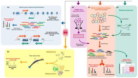 All of these tools and techniques are frequently aimed at investigating the bacteriome, which makes up the most significant portion of the microbiome but not its entirety. To classify the composition of the mycobiome, the fungal component of the microbiome, researchers often use a marker region, much like the 16S rRNA gene, called the internal transcribed spacer region of the nuclear ribosomal RNA cistron, referred to as the ITS region (Figure 1A), which provides a similar taxonomic resolution to that of 16S sequencing for bacteria [74]. The virome, the viral component of the microbiome, can be difficult to approach since there are no conserved marker regions like in the 16S rRNA gene in bacteria or the ITS region in fungi. Thus, the full virome must be sampled and compared to known viral sequences. Two problems arise from this, as current viral databases lack the characterization of many viruses, and consequently, any new viral sequences that do not match closely to those in current databases would be difficult to classify [75]. Another challenge for virome studies is the relatively low proportion of viral nucleic acid content alongside that of other microbes. However, there have been enrichment procedures proposed to increase the content of viral nucleic acids [76]. More recently, a new approach called single virus genomics (SVG) has been proposed (Figure 1B), in which individual viruses are isolated via fluorescence-activated viral sorting (FAVS), and genomic material is amplified and sequenced [77].