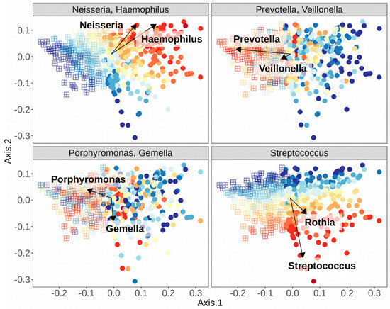 Gradients of abundances of consensus stomatotype-driving genera. Using a random subset of 500 samples from an oral microbiome dataset [10], samples were clustered into two stomatotypes using the weighted Unifrac distance measure. Type 1 samples are represented by circles and type 2 samples by squares. In each box, samples are colored by the total relative abundance of the indicated organisms. Overlaid are arrows indicating the tendency of the abundances of each organism noted in Table 3. In this subset of samples, Neisseria and Haemophilus strongly associate with stomatotype 1 samples, Prevotella strongly associates with stomatotype 2 samples while Veillonella does so weakly. The “variable stomatotype” drivers are indeed variable in their associations in this instance. Streptococcus shows a clear gradient but does not conform to either stomatotype. Gemella and Rothia, which have been shown to co-occur with Streptococcus in stomatotypes in the literature, do the same here, with Rothia more associated with stomatotype 1. However, Porphyromonas, which has been shown to co-occur with Streptococcus, Gemella, or Neisseria previously, associates with none of these here, and instead is strongly associated with stomatotype 2.