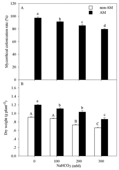 The colonization rate significantly decreased with increasing alkali concentration (p < 0.05). The maximum colonization rate (97.33%) was obtained in the control treatment (Figure 1A). Two-way ANOVA results showed that dry weight of seedlings was affected by the alkalinity concentration (p < 0.001) and the presence of arbuscular mycorrhizal fungi (p < 0.001, Table 1). The dry weights of seedlings with AM and seedlings without AM (CK) both decreased significantly with increasing alkali concentration (p < 0.05). For example, the dry weight decreased 27.4% and 28.3% at the highest alkalinity (300 mM) compared to that in the control in the non-AM seedlings and AM seedlings, respectively. In addition, the dry weight of AM seedlings was much higher than that of non-AM seedlings, both in the control and under alkali stress (Figure 1B).