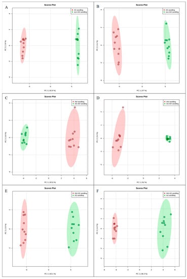 Principal component analysis (PCA) score plots of metabolic profiles in non-AM seedlings in response to alkali stress (A,B), AM seedlings in response to alkali stress (C,D) and comparison in non-AM seedlings and AM seedlings under alkali stress (E,F) in positive (A,C,E) and negative modes (B,D,F). PC1 and PC2 are the first two principal components.