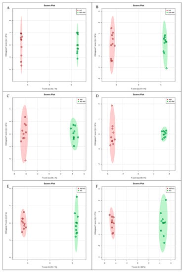 Orthogonal projections to latent structures-discriminate analysis (OPLS-DA) score plots of metabolic profiles in non-AM seedlings in response to alkali stress (A,B), AM seedlings in response to alkali stress (C,D) and comparison in non-AM seedlings and AM seedlings under alkali stress (E,F) in positive (A,C,E) and negative modes (B,D,F).