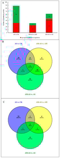 Identification and statistics of metabolic changes under alkali stress. (A) Number of up-or down-accumulated metabolic profiles between AM seedlings and non-AM seedlings of P. tenuiflora under alkali stress. (B) Venn diagram analysis of up-accumulated metabolic profiles in non-AM seedlings and AM seedlings under alkali stress. (C) Venn diagram analysis of down-accumulated metabolic profiles in non-AM seedlings and AM seedlings under alkali stress. CK: control treatment, AS: alkali stress without arbuscular mycorrhizal, AM: arbuscular mycorrhizal treatment, AM-AS: alkali stress with arbuscular mycorrhizal.