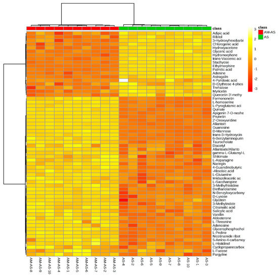 Heat map analysis combined with hierarchical cluster analysis in comparison between alkali stress with AM and only alkali stress treated seedlings of P. tenuiflora. AS: alkali stress without arbuscular mycorrhizal, AM-AS: alkali stress with arbuscular mycorrhizal.