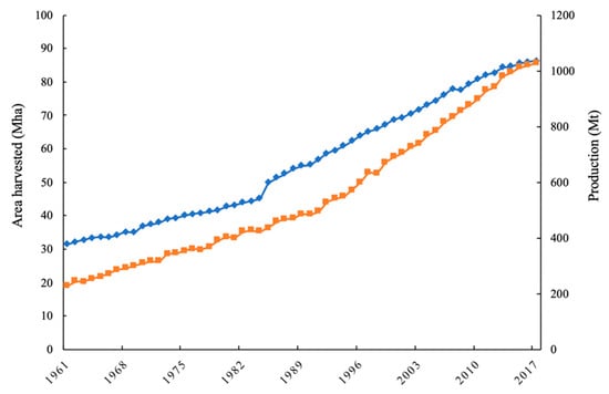 Total world area harvested (blue) and production (orange) of tree crops during the period 1961–2017 [1].