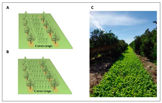 The majority of research on the benefits and impacts of cover crops to agroecosystems has focused on annual cash crops. In annual cropping systems, cover crops are primarily planted during the fallow season, often for only 3–5 months, when the cash crop is not in production [12,13]. The cover crop is then terminated and incorporated into the soil before planting the cash crop. However, as perennial crops often remain in production for over 20 years [20], there are critical differences in management and growth compared with annual cropping systems that can influence the soil microbiome and, therefore, the response to cover crops. In perennial systems, cover crops are planted in the inter-row middles or between trees (trunk-to-trunk, herein called “intercropping”; Figure 2); the latter is a less common practice due to potential competition for water between the tree and the cover crops when coverage is greater than 45% of the tree canopy [21]. Regardless of whether cover crops are planted in the inter-row or between trees, there is potential for both the tree and cover crops to share resources [12]. Unlike annual cropping systems, annual rotation and soil tillage are not present in perennial systems, which potentially allows for greater increases in soil organic matter (SOM) [11,22] and the development of more stable communities of beneficial microbial communities [23]. The timing of cover crop planting is another large difference between annual and perennial systems. In warmer climates, such as in Florida for citrus, year-round cover crop planting is possible for perennial systems, requiring multiple plantings and careful selection of cover crop species for each season. The limited space planted to cover crops in perennial compared with annual systems may also prolong the time needed to increase nutrient cycling [14]. However, in both perennial and annual systems, indirect effects on the soil microbial community through agricultural inputs (i.e., application of fertilizers, pesticides, and irrigation) may be similar.
