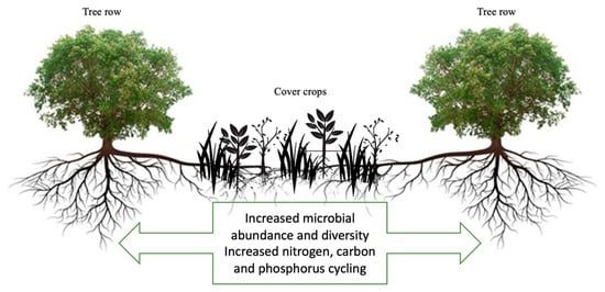 Increased interest in improving the sustainability of agriculture and availability of soil nutrients has led to renewed attention to cover cropping as an agricultural practice with benefits for growers and the environment. As with annual production systems, cover crops in tree cropping systems increase microbial abundance and diversity with concomitant positive effects on C, N, and P cycling. Particularly, intercropping with multispecies cover crop mixtures and minimum tillage and no-tillage not only enhances the soil microbiome but also SOM and N contents compared with monocropping, conventional tillage, and inorganic fertilization. Cover crop residues can also be a suitable strategy to increase the abundance of SOM-related genes, promoting plant degradation and, ultimately, increases in the content of SOM.