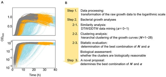 Two data-mining algorithms, dynamic time warping (DTW), and derivative dynamic time warping (DDTW), were used to measure the similarity between two growth curves (Figure 1B, step 2.1). Briefly, DTW [] calculated the distance of two growth curves (Equation (1)) and gave an optimal match between them.