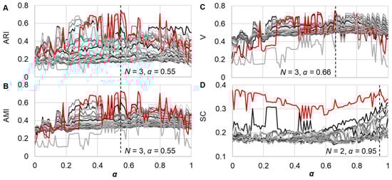 Similarity comparison with dynamic time warping (DTW) and derivative DTW (DDTW). The similarity of the growth curves was evaluated with DTW/DDTW, and the clustering was evaluated by four different statistical benchmarks, the adjusted Rand index (ARI) (A), adjusted mutual information (AMI) (B), the V-measure (V) (C), and the silhouette coefficient (SC) (D) Each line represents the changes in the statistical benchmark along with the changes in the weight ratio (α) of DTW/DDTW under a certain number (N) of clusters. A total of 28 lines in gray gradation are shown for all four benchmarks, representing n = 2–28. The red lines represent the optimal N determined with the four statistical benchmarks. The best combinations of α and N decided by the statistical benchmarks are indicated with the broken lines and the insets.