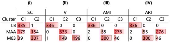 Clusters of the growth curves. The four benchmarks, SC, V, AMI and ARI are indicated in I–IV, respectively, according to the best combinations of α and N indicated in Figure 2. The determined clusters are shown as C1, C2, and C3. The growth curves categorized in different clusters are counted and correspond to the LB, MAA, and M63 growth media. The resultant numbers of the growth curves are indicated with both the values and the color bars.