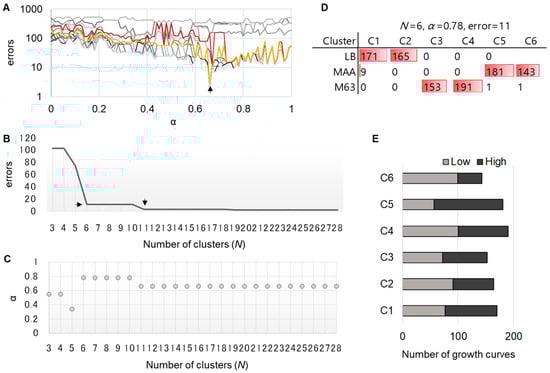 Subsequently, whether the six clusters, with the combination of n = 6 and α = 0.78, achieved a reasonable categorization of the growth curves was examined. The clustering results show that these 11 errors occurred mainly in the MAA medium (Figure 4D). Thus, the newly proposed benchmark, which made only 11 errors, largely improved the accuracy in clustering with biological meaningfulness. Additionally, in the case of the lowest errors, the present clusters were subdivided between the MAA and M63 media (Figure S2). This case was thought to be over clustered or over segmented because the present six clusters were already equivalent to an accuracy of ~99%, corresponding to the growth media.