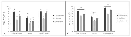 Quantification of viable cells of mono- and polymicrobial biofilms from a CDC biofilm reactor using three different coupon surfaces (panel A) and the same surfaces grown in a static way (panel B). Results display the mean ± SD (error bars) of three independent experiments. Statistical analysis was by one-way analysis of variance (ANOVA) with Holm–Sidak test. p-value < 0.001. Significant differences are reported with a = polypropylene vs. Teflon, b = polycarbonate vs. Teflon, and c = polypropylene vs. polycarbonate.