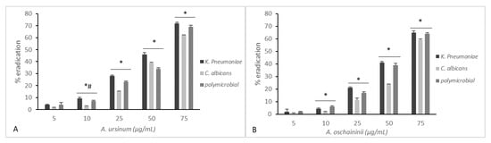 Comparison of minimal biofilm eradication concentration (MBEC) of the A. ursinum (panel A) and A. oschaninii (panel B) extracts on mono- and polymicrobial mature biofilms grown in static conditions in 96-well polystyrene plates. Testing performed in triplicate. Error bars represent standard deviation. Statistical analysis was by one-way analysis of variance (ANOVA) with Holm–Sidak test. Comparison of different treatment groups showed a significant reduction in log density for the two strains alone or together. (* p value < 0.001, # p value < 0.05 for 10 vs. 25).