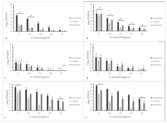 Comparison of minimal biofilm eradication concentration (MBEC) of the A. ursinum and A. oschaninii extracts on mono- and polymicrobial mature biofilms grown in dynamic conditions in a CDC reactor on different materials (A,B polycarbonate; C,D Teflon; E,F polypropylene). Testing performed in triplicate. Error bars represent standard deviation. Statistical analysis was by one-way analysis of variance (ANOVA) with Holm–Sidak test. Significance is valuated between different compound concentrations tested on the same coupon. (* p value < 0.001; ** p value < 0.05).