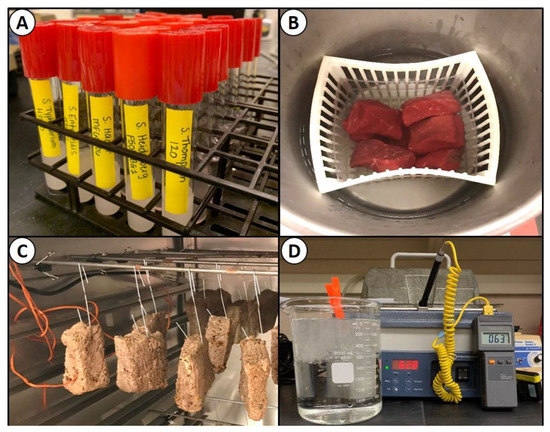 Beef pieces, as described previously, were inoculated with 150 uL of a five-serovar Salmonella mixture on each side that was spread with a gloved finger and held at 4–5 °C for 30 min to allow for bacterial attachment. The beef pieces were then tumbled (without vacuum) in a biltong spice mixture (2% salt) for 5 min until pieces were evenly coated. Beef pieces were then hung in a temperature-controlled humidity oven (Hotpack, Warminster, PA, USA) at 23.9 °C (75 °F) and 55% relative humidity (RH) and allowed to dry for up to 4 days (Figure 1C). Beef was sampled after inoculation (0 days), and after 2 and 4 days of drying. Beef samples were stomached with 1% nBPW and then serially diluted in 0.1% BPW. Serial dilutions were plated in duplicate (0.1 mL) on the surface of TSA, SCA, HE, and XLD (each containing spectinomycin, clindamycin, and novobiocin) and incubated for 48 h at 37 °C. Treatments were performed in triplicate replication.