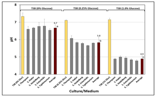 Analysis of spent broth pH for Salmonella cultures grown in Tryptic Soy Broth (TSB) containing 0%, 0.25%, or 1% glucose incubated at 37 °C for 18 hrs. The data bars in each set are pH values for the medium before inoculation, the five individual cultures after growth, and the average pH of the five cultures. Cultures include S. Thompson 120, S. Heidelberg F5038BG1, S. Hadar MF60404, S. Enteritidis H3527, and S. Typhimurium H3380. Data are presented as the mean of triplicate replications and error bars represent the standard deviation from the mean. Means (for average pH) with different letters are significantly different, as determined by one-way ANOVA using the Holm–Sidak test for pairwise multiple comparisons to determine significant differences (p < 0.05); means with different letters are significantly different (p < 0.05).