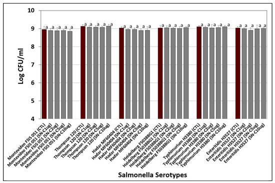 Salmonella serovars used in this study included: Salmonella enterica subsp. enterica serotype Thompson 120 (chicken isolate), Salmonella enterica subsp. enterica serotype Heidelberg F5038BG1 (ham isolate), Salmonella enterica subsp. enterica serotype Hadar MF60404 (turkey isolate), Salmonella enterica subsp. enterica serotype Enteritidis H3527 (phage type 13a, clinical isolate), Salmonella enterica subsp. enterica serotype Typhimurium H3380 (DT 104 clinical isolate), and Salmonella enterica subsp. enterica serotype Montevideo FSIS 051 (beef isolate). These are well-characterized strains that have been used in numerous research publications involving antimicrobial interventions against Salmonella spp [22,23,24,25].