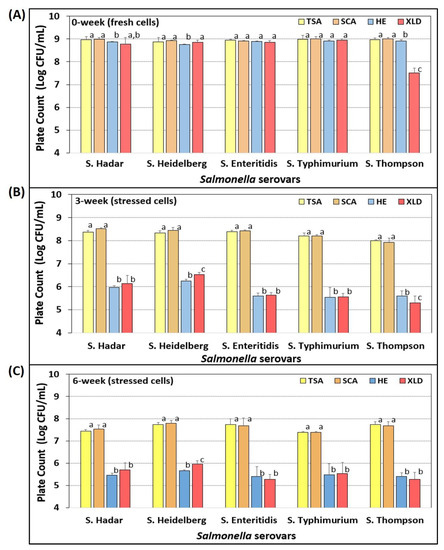 Comparison of four selective media for enumeration of individual Salmonella serovars after extended nutrient starvation for 0-weeks (A), 3-weeks (B), and 6-weeks (C) at 4 °C. Each serovar was plated on TSA, SCA, HE, and XLD containing spectinomycin (5 ug/mL), novobiocin (50 ug/mL), and clindamycin (5 ug/mL). Cultures included S. Thompson 120, S. Heidelberg F5038BG1, S. Hadar MF60404, S. Enteritidis H3527, and S. Typhimurium H3380. Data are presented as the mean of triplicate replications of cultures and their dilutions, and error bars represent the standard deviation from the mean. Within the same serotype, comparisons of means with different letters are significantly different (p < 0.05) as determined by one-way ANOVA using the Holm–Sidak test for pairwise multiple comparisons; means with the same letter are not significantly different (p > 0.05).