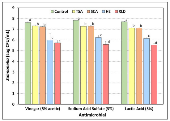 Acid-stress response of five-serovar mixtures of Salmonella inoculated on the surface of raw beef and subject to 30-sec dip treatment in vinegar (5% acetic acid), sodium acid sulfate (3%), and lactic acid (5%). Treated samples were then plated on TSA, SCA, HE, and XLD containing spectinomycin (5 ug/mL), novobiocin (50 ug/mL), and clindamycin (5 ug/mL). Cultures in the mixture included S. Thompson 120, S. Heidelberg F5038BG1, S. Hadar MF60404, S. Enteritidis H3527, and S. Typhimurium H3380. Data are presented as the mean of triplicate replications and error bars represent the standard deviation from the mean. Control represents inoculum level on beef pieces before antimicrobial treatment. Means with different letters are significantly different (p < 0.05) as determined by one-way ANOVA using the Holm–Sidak test for pairwise multiple comparisons to determine significant differences; means with the same letter are not significantly different (p > 0.05).