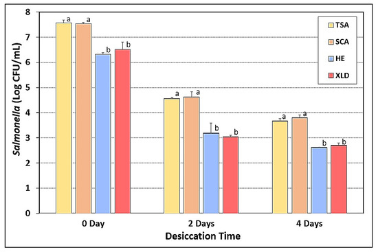 Desiccation-stress response of five-serovar mixtures of Salmonella inoculated on the surface of raw beef pieces and subjected up to 4-days drying in a humidity chamber at 23.9 °C (75 °F) and 55% RH. Treated samples were then plated on TSA, SCA, HE, and XLD containing spectinomycin (5 ug/mL), novobiocin (50 ug/mL), and clindamycin (5 ug/mL). Cultures in the mixture included S. Thompson 120, S. Heidelberg F5038BG1, S. Hadar MF60404, S. Enteritidis H3527, and S. Typhimurium H3380. Data are presented as the mean of triplicate replications and error bars represent the standard deviation from the mean. Means with different letters are significantly different (p < 0.05) as determined by one-way ANOVA using the Holm–Sidak test for pairwise multiple comparisons to determine significant differences; means with the same letter are not significantly different (p > 0.05).
