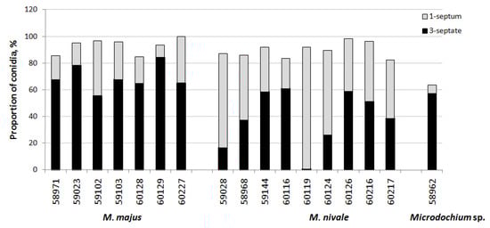The frequencies of occurrence of single-septum or three-septate conidia in the strains of these two species were assessed. According to the calculations, the share of single-septum conidia ranged from 9.5 to 40.9%, and that of three-septate conidia was 55.5–84.2% among all macroconidia in the M. majus strains (Figure 5). In M. nivale, these measurements were 22.7–90.1% and 0.6–61.0%, respectively. On average, the occurrence of three-septate macroconidia in M. majus was 68.9 ± 9.4%, while that in M. nivale was 38.7 ± 21.0%.