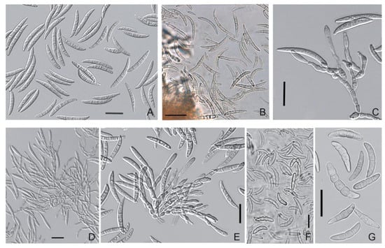 Microdochium sp. strain MFG 58962: (A,B) conidia; (C–E) conidiophores with conidiogenous cells; and (F,G) thick walled conidial cells. Media: (A–E) PSA; (F,G) oatmeal agar. Scale bars: (A–G) 20 μm.