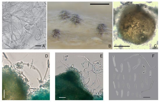M. seminicola strain MFG 60138: (A) the coils in hyphae; (B,C) ascomata on wheat stems; (D) conidia; (E) germinated ascospores that exuded from perithecium; and (F) variety of formed spores, some of them germinated. Media: (A) PSA; (B–F) wheat stems. Scale bars: (A,D–F) 20 μm; (B) 200 μm; (C) 50 μm.