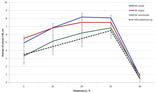 The growth rates of M. majus and M. nivale strains were similar at all temperatures analyzed. The highest estimated average growth rate of these species was detected at 20–25 °C (1.17 cm/day for M. majus and 1.27 cm/day for M. nivale).