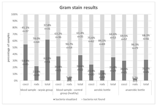Traditional methods in automated blood culture systems detect only living bacteria, capable of cell division, while the Gram stain and molecular methods can confirm the presence of cell structures or their nucleic acids, without information on the metabolic activity of cells []. In our study, we attempted to increase the detectability of bacteria directly in the blood and post-culture fluids using Gram stain and FISH with the application of the methodology that was devised by our team. Eight (8.9%) out of 90 of the collected blood culture sets demonstrated growth. The low percentage of positive cultures compared to global data may have probably been associated with the use of antibiotics prior to blood sample collection for microbiological testing. The clinical characteristics of the group of patients excluded from the study, due to positive blood culture results, is similar to the study group, therefore the condition of the patients could not affect the culture results (Table 1). Patients who took part in the study had undergone thoracic surgery, in which infectious pulmonary complications were predominant. For that reason, the patients had received intravenous antibiotics before the development of septic symptoms, which might have influenced the results of blood cultures, but not the results obtained through Gram stain or FISH []. Despite the antibiotic therapy applied and the fact that the amount of blood drawn for testing was modest, both methods allowed the visualization of bacteria in the blood of those patients whose cultures gave negative results (Figure 1, Figure 2 and Figure 3). Moreover, these methods also enabled us to detect bacteria in post-culture fluids, which were considered negative by the automated blood culture system; therefore, a portion of the results may probably be classified as false negatives.
