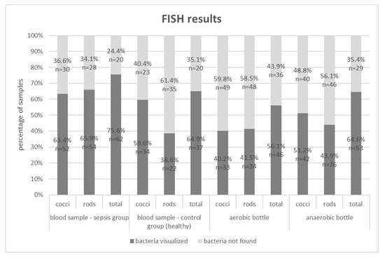 There are few studies that confirm the possibility of bacterial detection in negative blood culture fluids, with the use of an additional culture on enriched media or using Gram stain, however, due to the lack of a procedure for concentrating or purifying the samples or the use of FISH, the authors obtained lower percentages of bacterial detection compared to our results [,]. In the literature, there are no reports on the detection of bacteria directly in the blood using FISH, apart from the studies by our team, so we cannot compare the obtained results with other studies [,]. With the use of FISH, a high percentage of genetic material of Gram-negative bacteria in the blood samples of healthy individuals was detected, which would argue for the translocation of bacteria into the bloodstream and, generally, for the existence of bacterial DNAemia phenomenon, in completely healthy people [,,]. The presence of bacterial ribosomal RNA signals the presence of bacterial cells, hence, also their DNA, since ribonucleic acid degrades very quickly, in contrast to deoxyribonucleic acid. Elevated levels of circulating free DNA (cfDNA) in the blood that come directly from the breakdown of bacterial or phagocytic cells as well as resulting from necrosis or apoptosis have been described in pathological condition (sepsis, inflammation, stroke, cancer), physiological conditions (pregnancy, physical exertion), and following surgical procedures [,,].