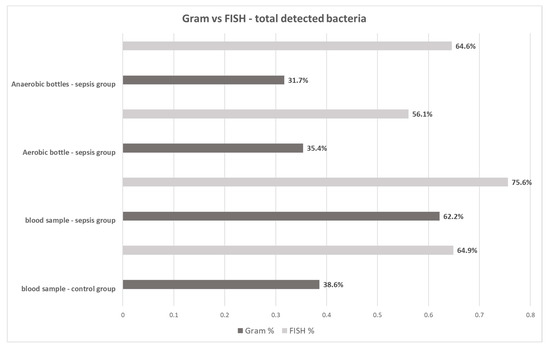 FISH demonstrated greater sensitivity in comparison with Gram staining. Both methods enable the detection of bacteria in media culture that did not show growth. Both methods revealed the presence of bacteria in the blood of patients with sepsis and the control group, which confirms the reports to date regarding the constant ‘physiological bacteremia’. Further studies are necessary to distinguish between contamination, asymptomatic bacteremia, and fully symptomatic clinical sepsis.