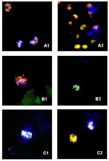 FISH photos from a fluorescent microscope: (A1,A2) blood sample from septic patients— smear with probes STA and EUB338—visible phagocytosed Staphylococcus spp. cells; (B1,B2) negative samples in blood culture media—smear with probes STA, ENT183 and EUB338—visible phagocytosed Staphylococcus spp. and Enterobacteriaceae cells; (C1,C2) blood sample from healthy volunteers—smear with probes STA and EUB338 smear with probes STA, ENT183 and EUB338— visible phagocytosed Staphylococcus spp. and Enterobacteriaceae cells. 1000x zoom.