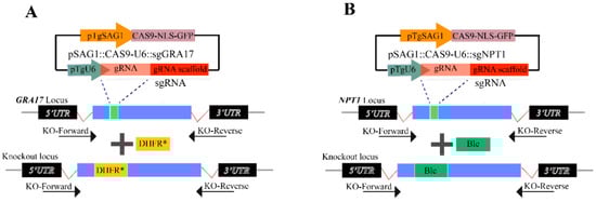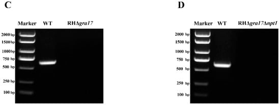 We previously demonstrated that live-attenuated T. gondii RH strain deficient in gra17 (Figure 1A,C) was immunogenic in mice []. Interestingly, the NPT1 protein of T. gondii has been reported to play a key role in the growth and virulence of T. gondii, and the deletion of npt1 gene in the RH strain also rendered the parasite immunogenic in mice []. We investigated whether a double mutant T. gondii strain deficient in gra17 gene and npt1 gene can be more immunogenic than mutant strain deficient in a single gene only. To accomplish this, a stable, single, and phleomycin-resistant strain of RHΔgra17Δnpt1 was successfully engineered by deleting the npt1 gene in RHΔgra17 strain using CRISPR/Cas9-mediated non-homologous end joining (Figure 1B,D).