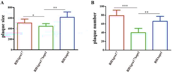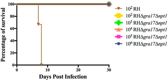 To evaluate the in vivo virulence of RHΔgra17Δnpt1, serial doses (102, 103, 104, 105, 106 tachyzoites) of RHΔgra17Δnpt1 strain or 102 tachyzoites of wildtype (WT) RH strain were intraperitoneally (i.p.) injected into mice. The infected mice were monitored daily for the signs of toxoplasmosis, and the mortality was recorded for 30 days. We also examined the ability of RHΔgra17, RHΔnpt1, and RHΔgra17Δnpt1 to proliferate in mice. To achieve this, each mouse was infected i.p. with 103 tachyzoites (five mice/strain), and five days later, the parasite burden in the peritoneal fluid was examined by plaque assay as described previously []. Briefly, mice were humanely sacrificed, and peritoneal cells were harvested by lavage with phosphate buffered saline (PBS) containing 1% FBS. The harvested peritoneal cells were mechanically disrupted using a 17-gauge needle syringe in order to liberate intracellular parasites. Then 100 µL freshly liberated parasites were used to infect confluent HFF monolayers maintained in RPMI1640 medium for seven days. Then, T. gondii-infected HFFs were fixed and stained, and the sizes and numbers of plaques formed by the growing tachyzoites were determined using the plaque assay as described previously [].