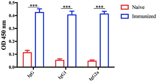 Serum antibody levels in mice vaccinated with RHΔgra17Δnpt1. The levels of total IgG and IgG isotypes (IgG1 and IgG2a) were determined in the serum of Kunming mice vaccinated with RHΔgra17Δnpt1. Analysis was performed by using ELISA at 60 days post-vaccination. Results are expressed as mean of OD450 ± SD, and level of significance was compared to control naïve mice (***, p < 0.001).