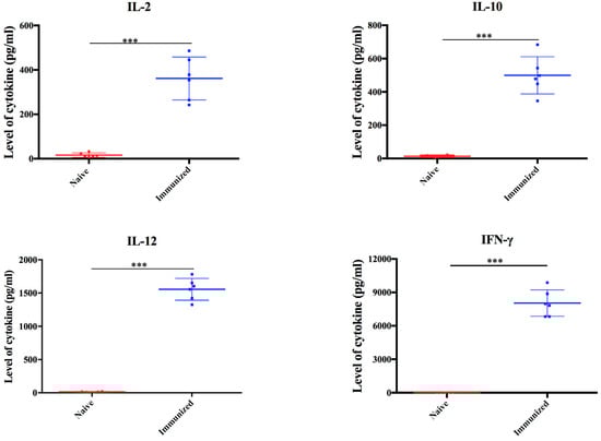The levels of cytokines detected in the supernatant of splenocyte cultures of RHΔgra17Δnpt1-vaccinated mice. Spleen cells were harvested from vaccinated and naïve mice at 60 days post-immunization and stimulated in vitro with 10 µg/mL STAg. Evaluation of Th1 (IL-2, IL-12 and IFN-γ) and Th2 (IL-10) cytokines in the splenocyte culture supernatants was performed using ELISA. Data points are represented as means ± SD. A statistically significant difference is indicated by ***, p < 0.001.