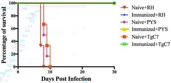 Survival curves of vaccinated and infected mice. At 60 days post-vaccination, mice were i.p. challenged with 103 T. gondii tachyzoites of RH, PYS, or TgC7 strains (6 mice/strain), and monitored for 30 days. Survival curves of RHΔgra17Δnpt1-vaccinated mice showed a high survival rate compared to naïve mice.