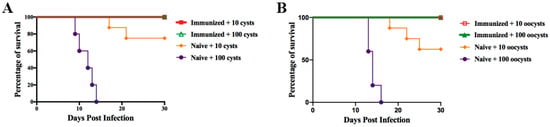 Protective effect of RHΔgra17Δnpt1 vaccination against chronic T. gondii infection using tissue cysts or oocysts. Survival rates following challenge of RHΔgra17Δnpt1-vaccinated mice with (A) 10 or 100 tissue cysts, or (B) 10 or 100 oocysts of type 2 Pru strain at 60 days post-vaccination over 30 days. All RHΔgra17Δnpt1-vaccinated mice survived regardless of the inoculation dose or the parasite stage (cyst or oocyst) compared to naive mice. Eight mice per group were infected with 10 cysts or oocysts, and five mice per group were infected with 100 cysts or oocysts.