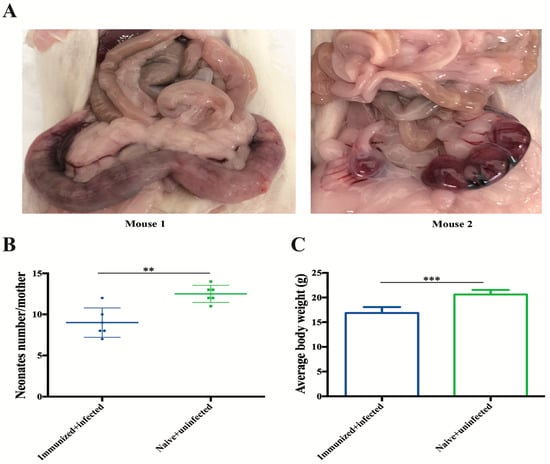 Pregnant mice were orally challenged with 10 T. gondii Pru oocysts on day 5 of gestation (each group contained six mice). Then, the abortion rate of pregnant mice, and the litter size and bodyweight of the neonates were recorded daily. Two dams from the unvaccinated + oocysts-infected group were euthanized at 14 and 17 days after infection due to inability to eat or drink, and their uterus showed severe pathological lesions (Figure 8A). Abortion was observed in the other four dams, including one dam that was euthanized at 21 days after infection due to inability to reach food or water. In contrast, no abortions were detected in the dams from RHΔgra17Δnpt1 vaccinated + oocyst-infected group and unvaccinated + uninfected mice, and all their pups were successfully delivered. However, the litter size and bodyweight of neonates of unvaccinated + uninfected dams were significantly larger compared to those of RHΔgra17Δnpt1 vaccinated + oocyst-infected dams (Figure 8B,C).