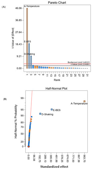 (A) Pareto charts and (B) half-normal plot for two-level factorial design. Above the Bonferroni limit (3.49121) the effects are significant. Effects in between the t-limit (2.04841) and Bonferroni limit may possibly be significant. Effects below the t-value limit are insignificant.