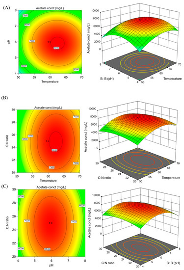 Three-dimensional response surface plots showing acetate concentration by thermophilic acetogenic consortium and interaction between: (A) pH and temperature; (B) C:N ratio and temperature; (C) C:N ratio and pH. The minimum and maximum values are represented by green and red color, respectively. The other colors represent values in between the minimum and maximum values. These plots and graphs were created for the pair-wise combination of the two factors while keeping the third factor at its optimum value.