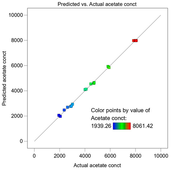 Surface response plot for predicted vs. actual values (acetate conct. in mg L−1). The squares represent the experimental values obtained from the runs. The concentration of the data values near the straight line shows a high correlation and adequate precision. The minimum value is denoted by a blue color, whereas the maximum value is denoted by a red color. The rest of the colors represent a range between the minimum and maximum value.
