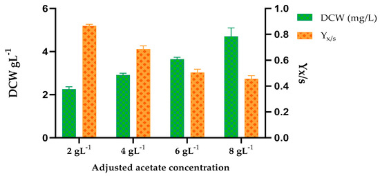 During the experimental observation period of 20 days, batch cultures with four different concentrations of the fermentate (adjusted to achieve acetate concentration of 2, 4, 6, and 8 g/L) showed an increase in biomass density (in term of DCW) with increasing acetate concentration. (Figure 4, Table 6). Since all the concentrations of acetate selected for this study were conducive for cell growth of Y.lipolytica, higher initial acetate concentrations could help achieve higher cell densities. Higher acetate concentration can be attained by increasing the organic load of SOW in the anaerobic fermentation process using the thermophilic acetogenic consortium and the optimized parameters of this study. However, an important parameter to be considered for analyzing economical and practical application is the growth yield coefficient, YX/S, which appeared to decrease when higher concentrations of adjusted acetate levels (6 and 8 g L−1) were used (Table 6).